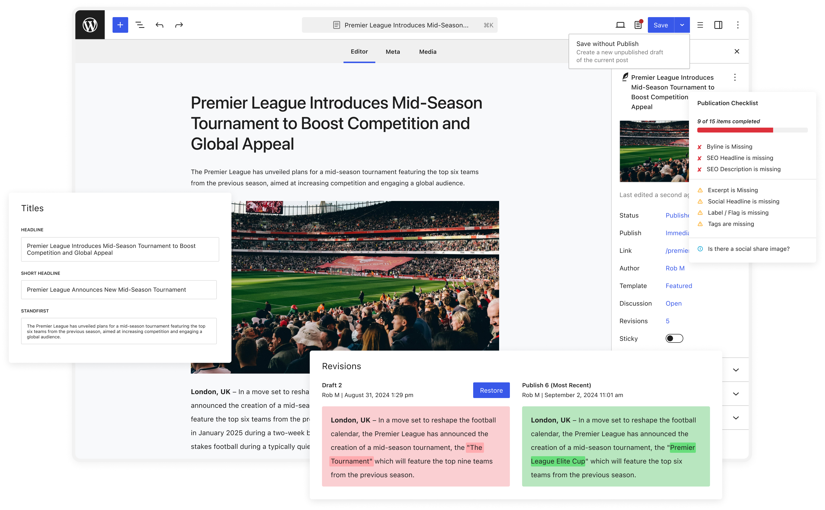 - Automatically sync with core fields such as headline & taxonomies